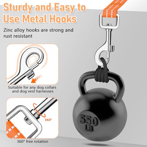 The handle is cushioned with a softer SBR inner layer to reduce discomfort and improve grip when a dog pulls. Reflective threads are sewn into the line to boost visibility in low light and a sturdy metal D-ring provides a place for keys or small accessories. A heavy duty zinc alloy hook is nickel plated for rust resistance and designed to rotate to reduce tangles, supporting reliable outdoor use.