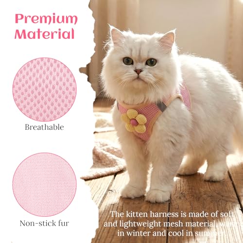 Adjustable breathable mesh cat harness and leash set for kittens and small pets, offering secure fit and escape-proof control for walking and training. Reflective strips improve visibility on early morning or evening outings.
