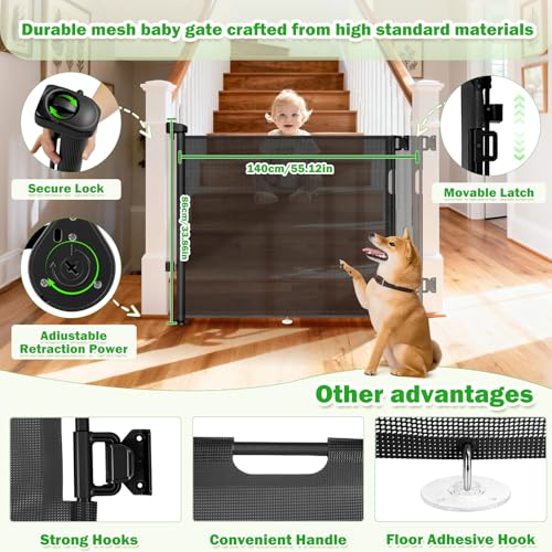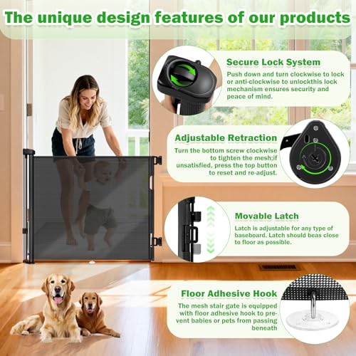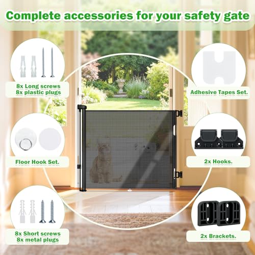 Retractable stair gate for dogs and cats, suitable for households with babies, providing a compact mesh barrier to restrict access to doorways, hallways or stairs. Adjustable retraction and secure two-step lock improve safety and neat storage.