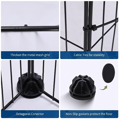 The frame is sturdy metal with 100% eco-friendly polypropylene resin panels and ABS connectors. An iron mesh lower layer and 1.7 cm mesh size reduce chewing and prevent pets getting caught.