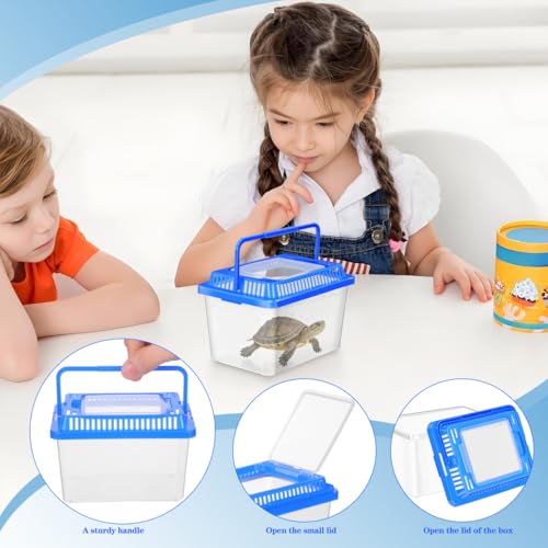 Portable plastic aquarium tank with handle and lid for safe transport and temporary housing of small fish and turtles. Transparent design lets you monitor pets, while the top lid and perforations support feeding and ventilation for reptiles and small animals like hamsters.