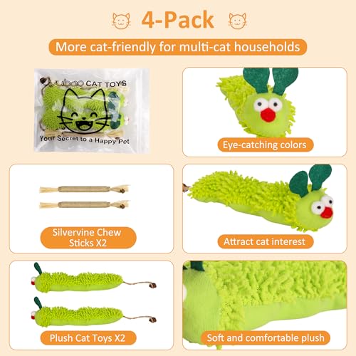 The 4-pack contains two soft plush caterpillars and two natural silvervine chew sticks. Model CATOY-4PCS and includes a 2 year warranty.