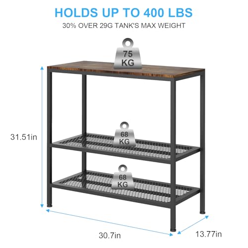 Long fish tank stand for 5-29 gallon aquariums, suitable for fish or reptile tanks. Its adjustable middle shelf and three-tier storage provide versatile organisation and a strong 350 lb load capacity for stable, space-saving display.