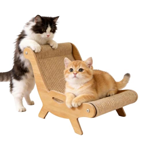 Multifunctional sisal cat chair is a wooden lounger and scratching post for small to medium cats, combining a rest spot with a durable sisal surface that redirects scratching to protect furniture and save space while providing a stable, comfortable place to relax.