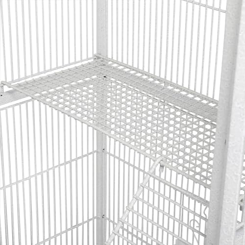 The interior is split into three sections by two platforms and ladders that are not fixed, so you can rearrange perches and toys to encourage climbing and activity. Multiple access points make feeding and maintenance straightforward and allow for adding feeders, breeding boxes or a birdbath which are not included. A slide-out tray and bottom grate separate droppings from resting areas, making cleaning quicker for owners who want a tidy indoor setup.