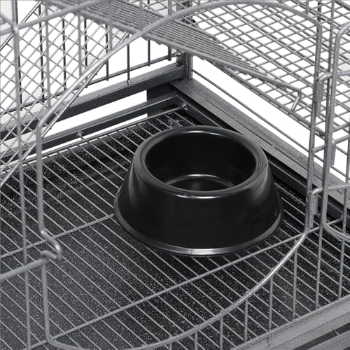 The cage is built from powder-coated steel for strength and resistance to wear and water, so it stands up to regular use while remaining straightforward to maintain. Two front doors with secure latches give easy access to different levels, and a removable tray plus detachable ramps and platforms mean cleaning and interior changes are simple in practice. A food bowl and water bottle are included so the enclosure can be set up quickly.