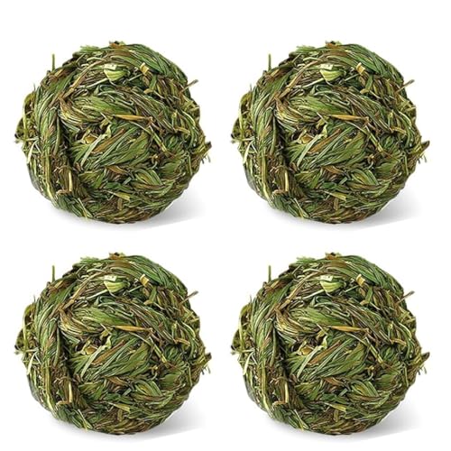 Natural Timothy grass chew balls for rabbits, guinea pigs, hamsters and gerbils, sold as a 4-pack for cage play and chewing. Chemical-free, biodegradable design supports dental health and provides enrichment to reduce boredom.